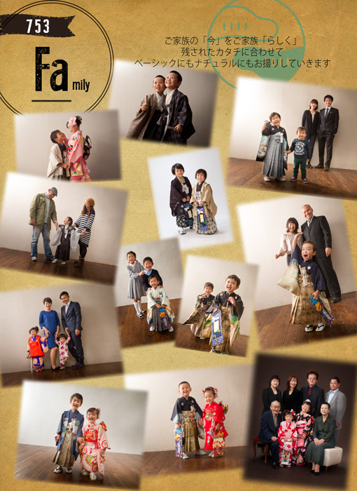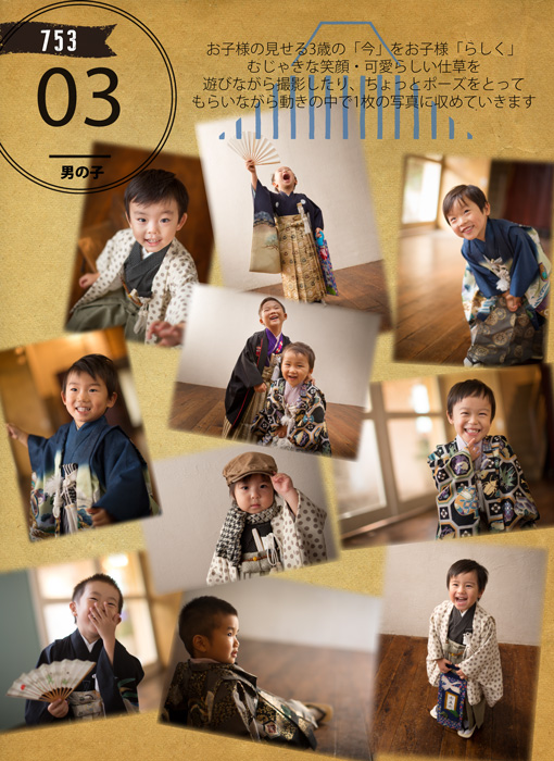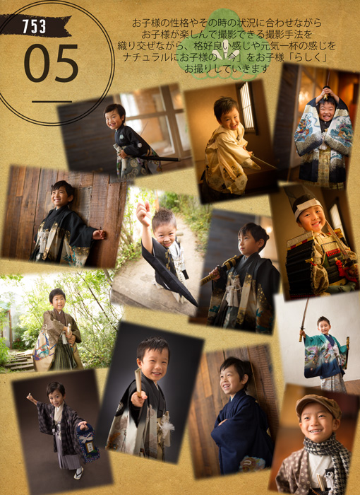 3才のお子様は「今」の時期しか見せない可愛らしさ・むじゃきな仕草・表情を、5才の男の子はキリっとした表情やポーズ・元気いっぱいの「今」をお撮りし、7才の女の子はお着物の姿「美」を求めながらキレイな表情・可愛らしい表情をお子様「らしく」一瞬・一瞬をお撮りしていきます。